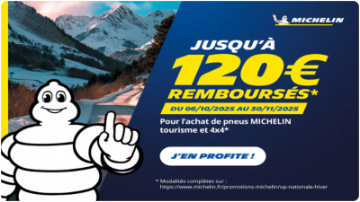 💰 Jusqu’à 120€ remboursés pour l’achat d’au moins 2 pneus auto ou 4x4 MICHELIN