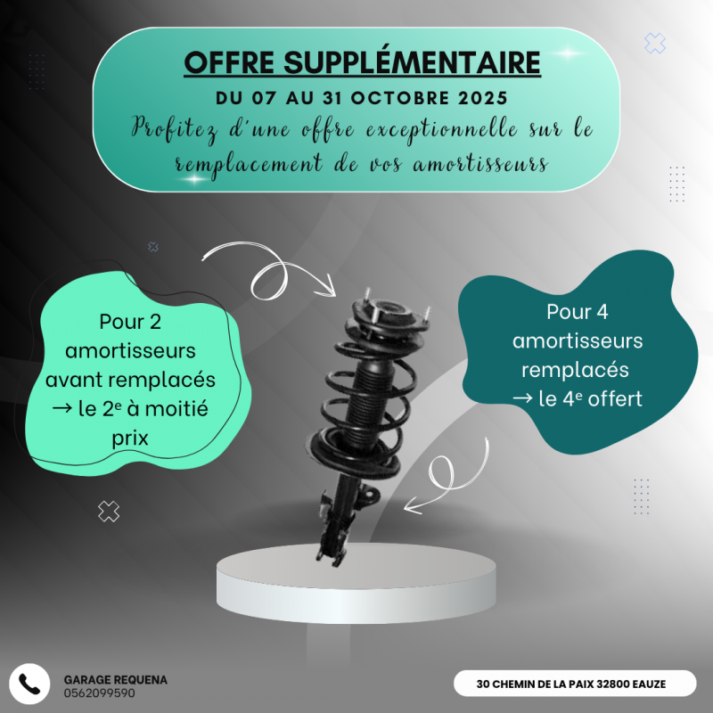 📆Du 07 au 31 octobre 2025, profitez d’une offre exceptionnelle sur le remplacement de vos amortisseurs :